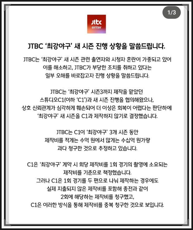 2025년 초, 최강야구 시즌4를 준비하던 과정에서 예정된 트라이아웃이 갑작스럽게 취소되며 갈등이 표면화되었습니다. JTBC는 공식적으로 "프로그램 재정비를 위한 시간"이라고 발표했지만, 제작사인 스튜디오 C1 측은 이를 반박하며 "트라이아웃은 예정대로 진행될 것"이라고 밝혔습니다. 이러한 상반된 입장은 단순한 일정 조정 문제가 아니라 제작비와 관련된 심각한 갈등으로 이어졌습니다.