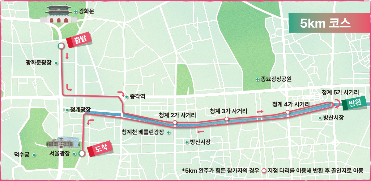 - 코스 경로: 광화문광장 → 종각역 → 청계천 → 청계5가 → 서울광장