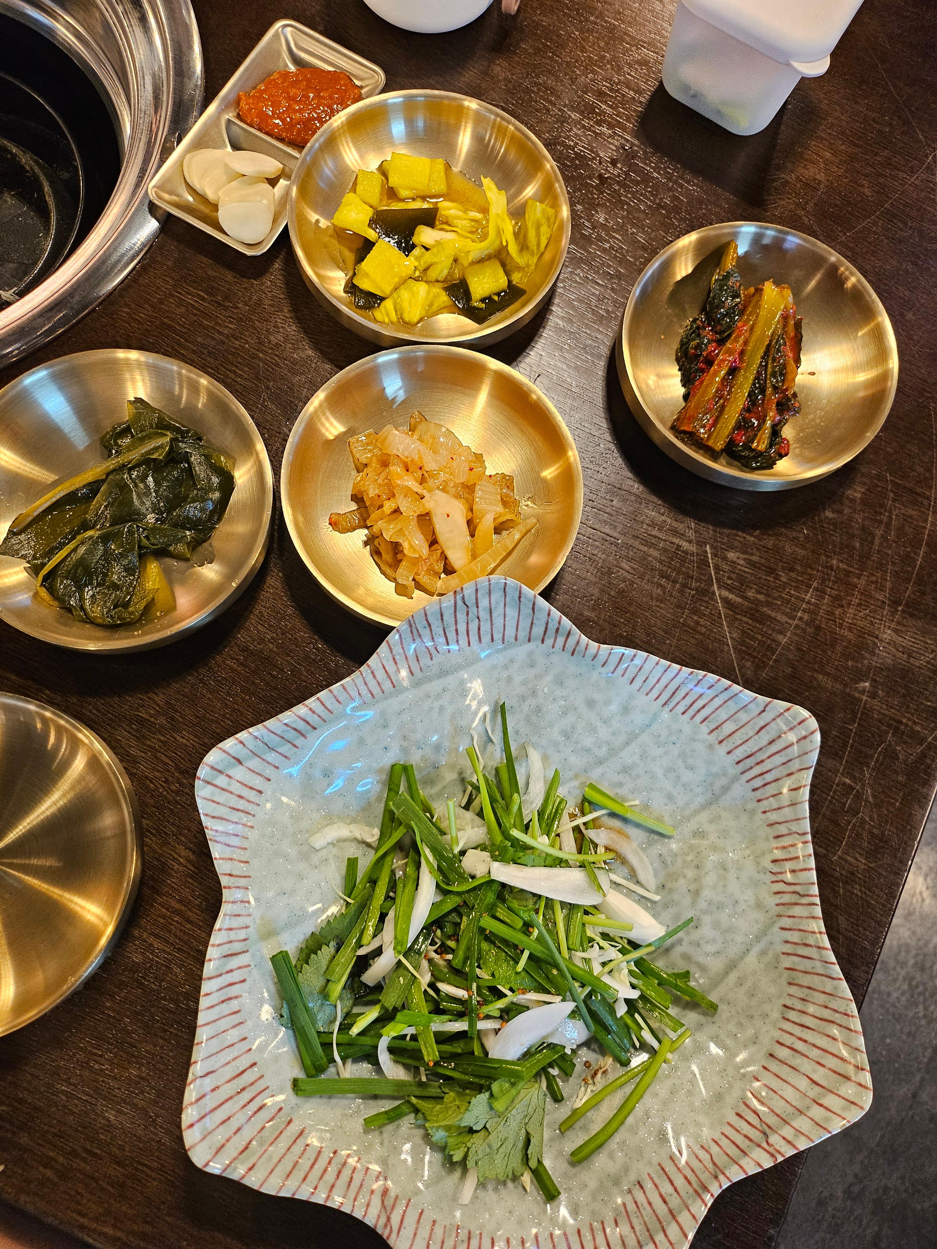 자리에 앉자마자 절임 반찬 4종 + 쌈채소 한 접시가 등장.
