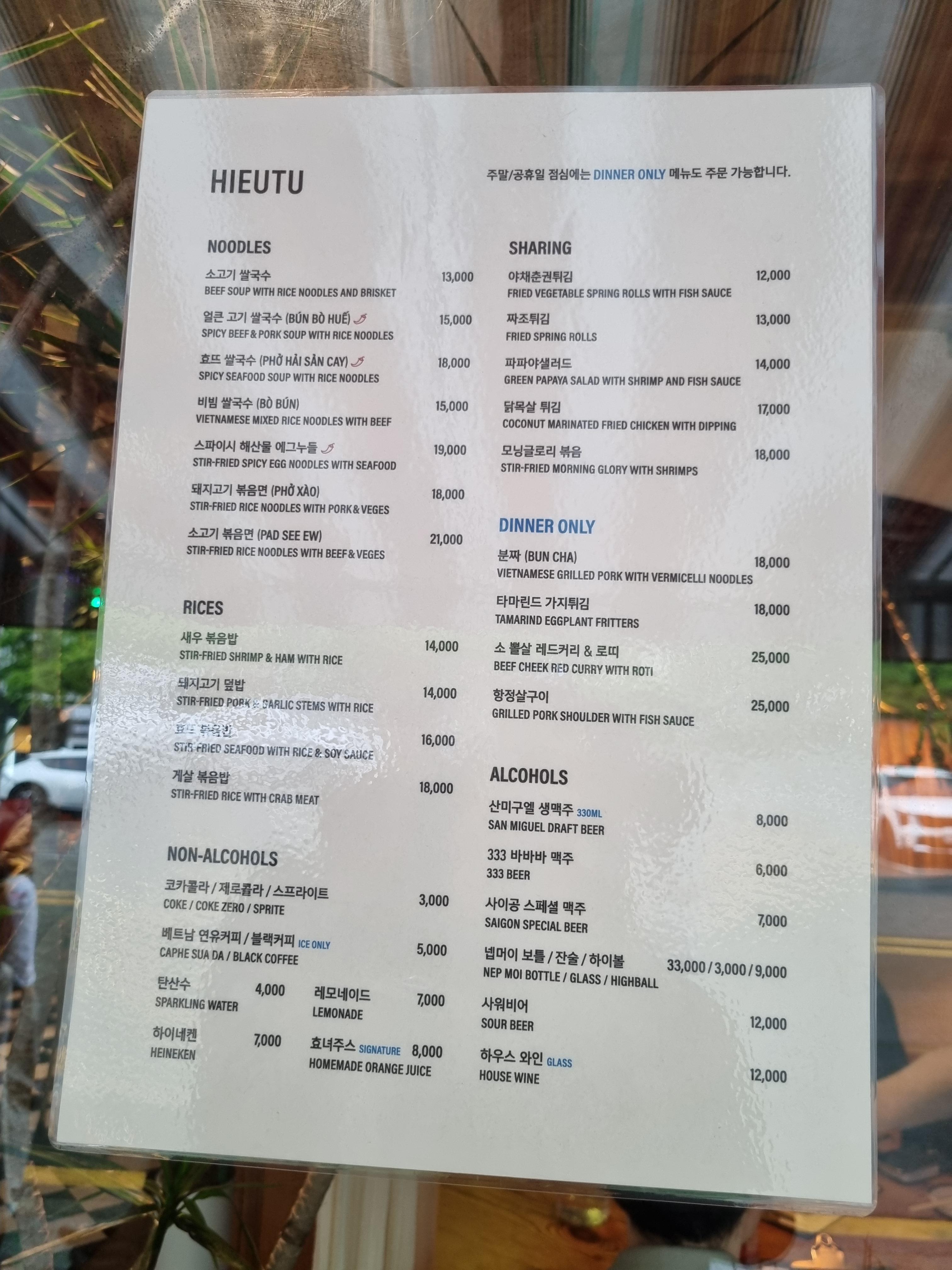 가격대는 쌀국수 13,000원, 볶음밥 16,000원, 파파야 샐러드 14,000원, 산미구엘 생맥주 7,000원 정도로, 가성비 좋은 편이라고 느꼈습니다.