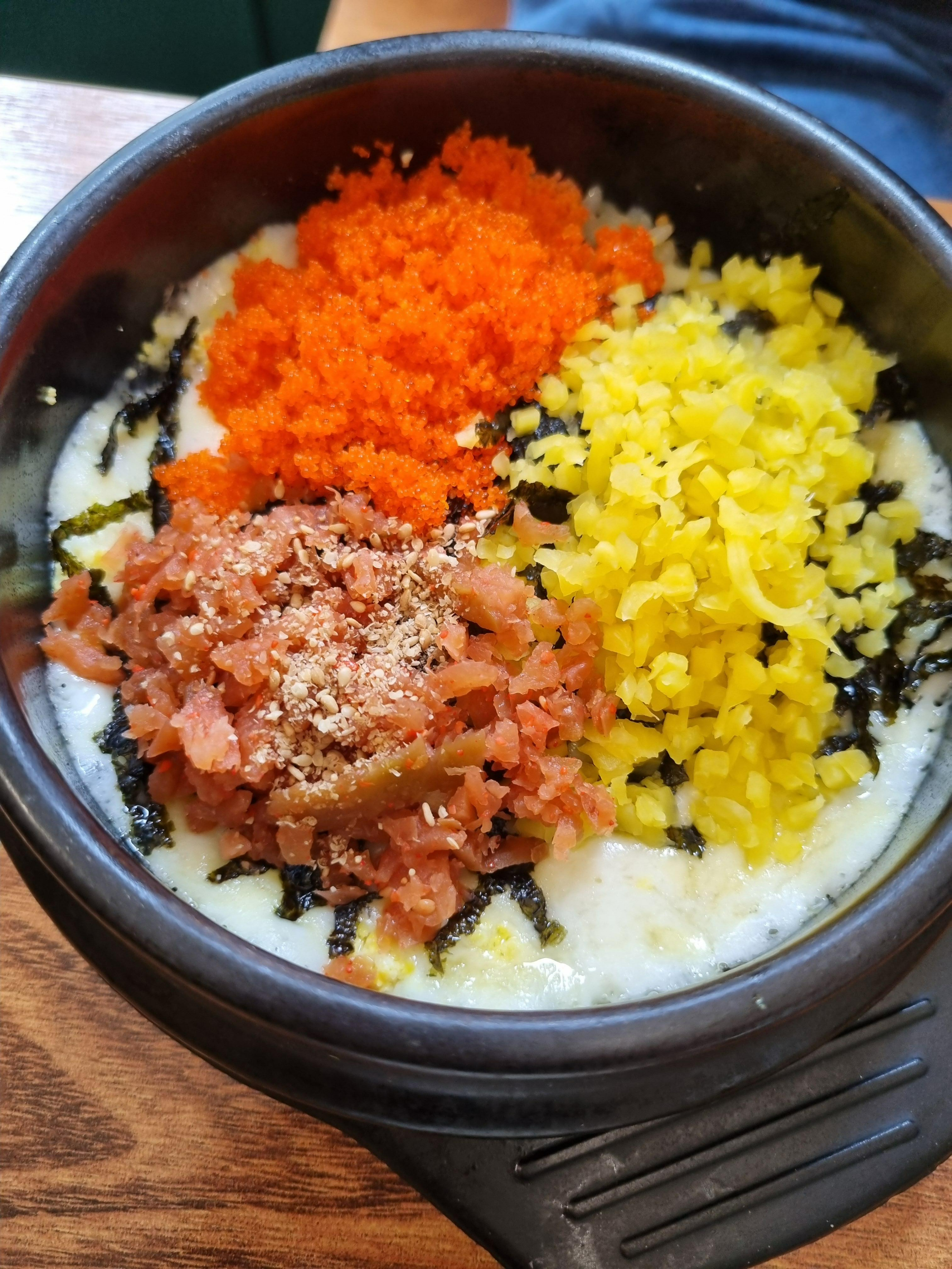 함께 나오는 치즈알밥은 따끈한 밥 위에 날치알과 치즈, 그리고 고소한 김가루가 올려져 있어, 냉면과 번갈아 먹기 딱 좋은 조합이었습니다.