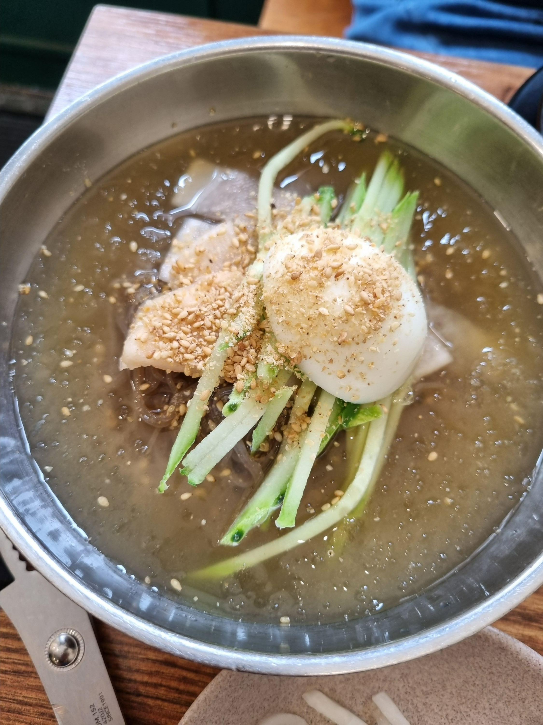 물냉면은 시원한 동치미 베이스 육수에 쫄깃한 면발, 그리고 새콤한 맛이 입맛을 살려줘요.