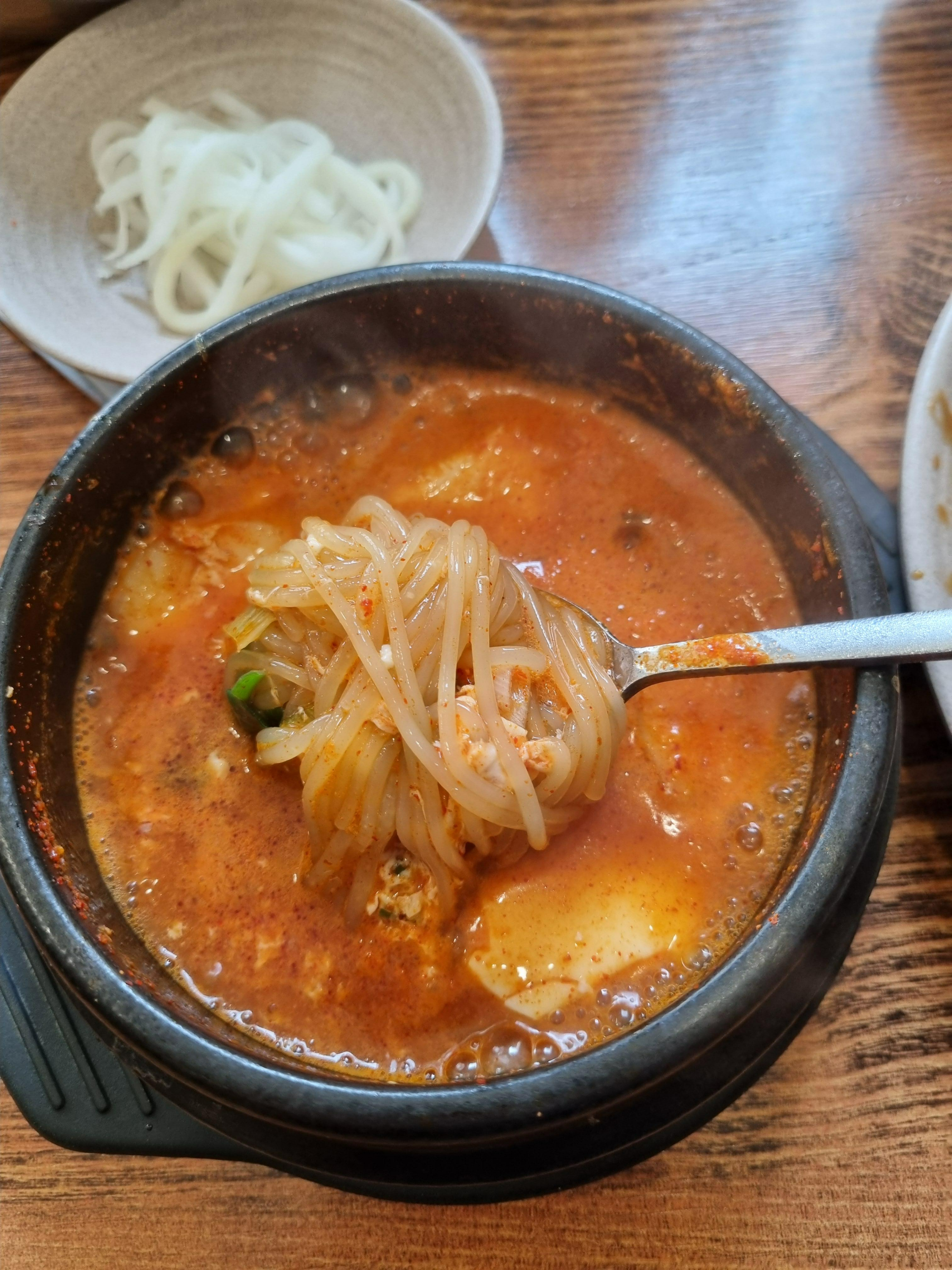 함께 나오는 쫄순(쫄면+순두부)은 까치네의 시그니처 메뉴로, 매콤달콤한 양념에 쫄깃한 면과 고소한 순두부가 환상의 조화를 이룹니다.