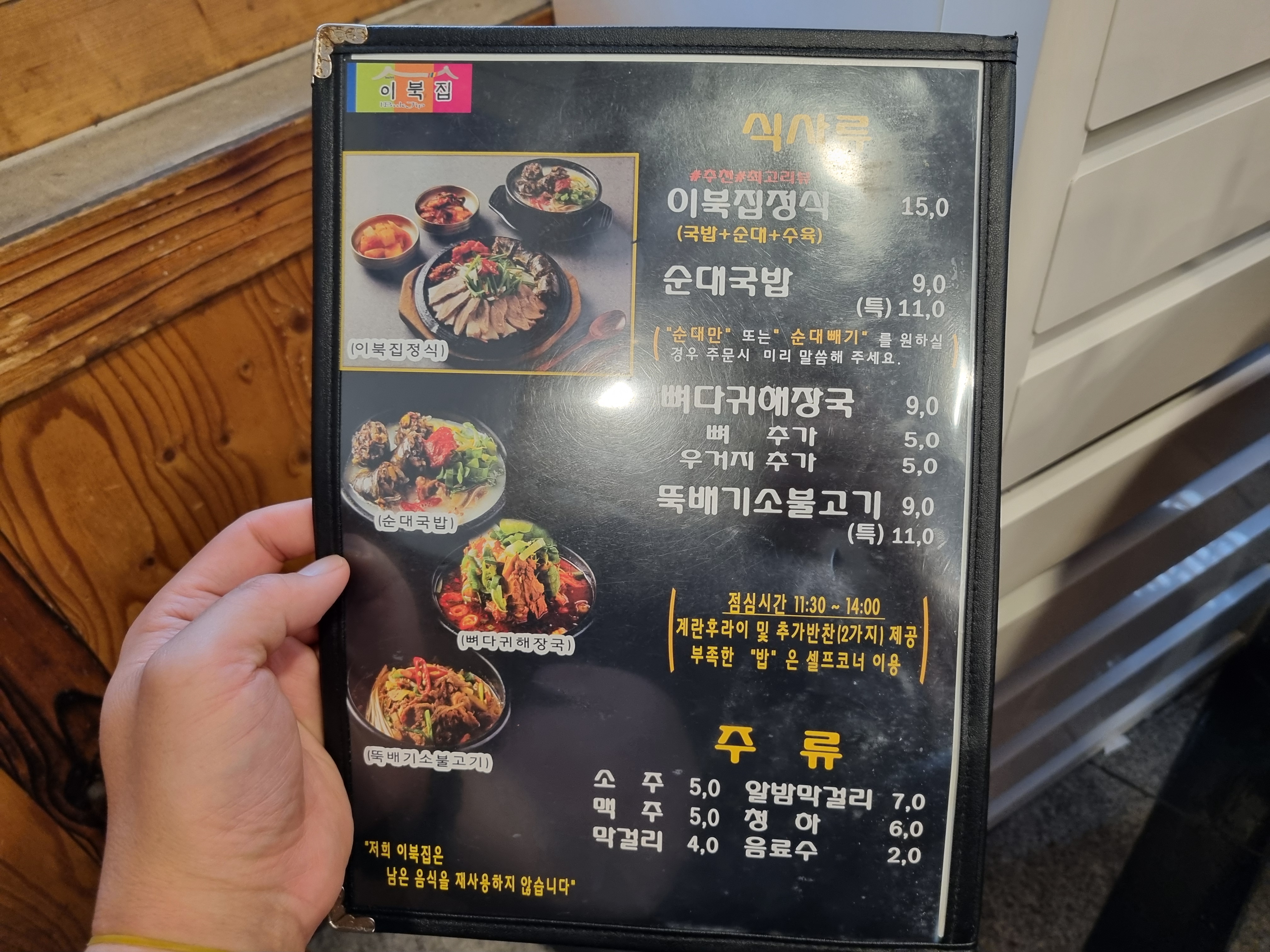 - 💰 대표메뉴: 이북집정식 15,000원 / 순대국 9,000원 / 오징어순대, 해물파전 등 안주 다양