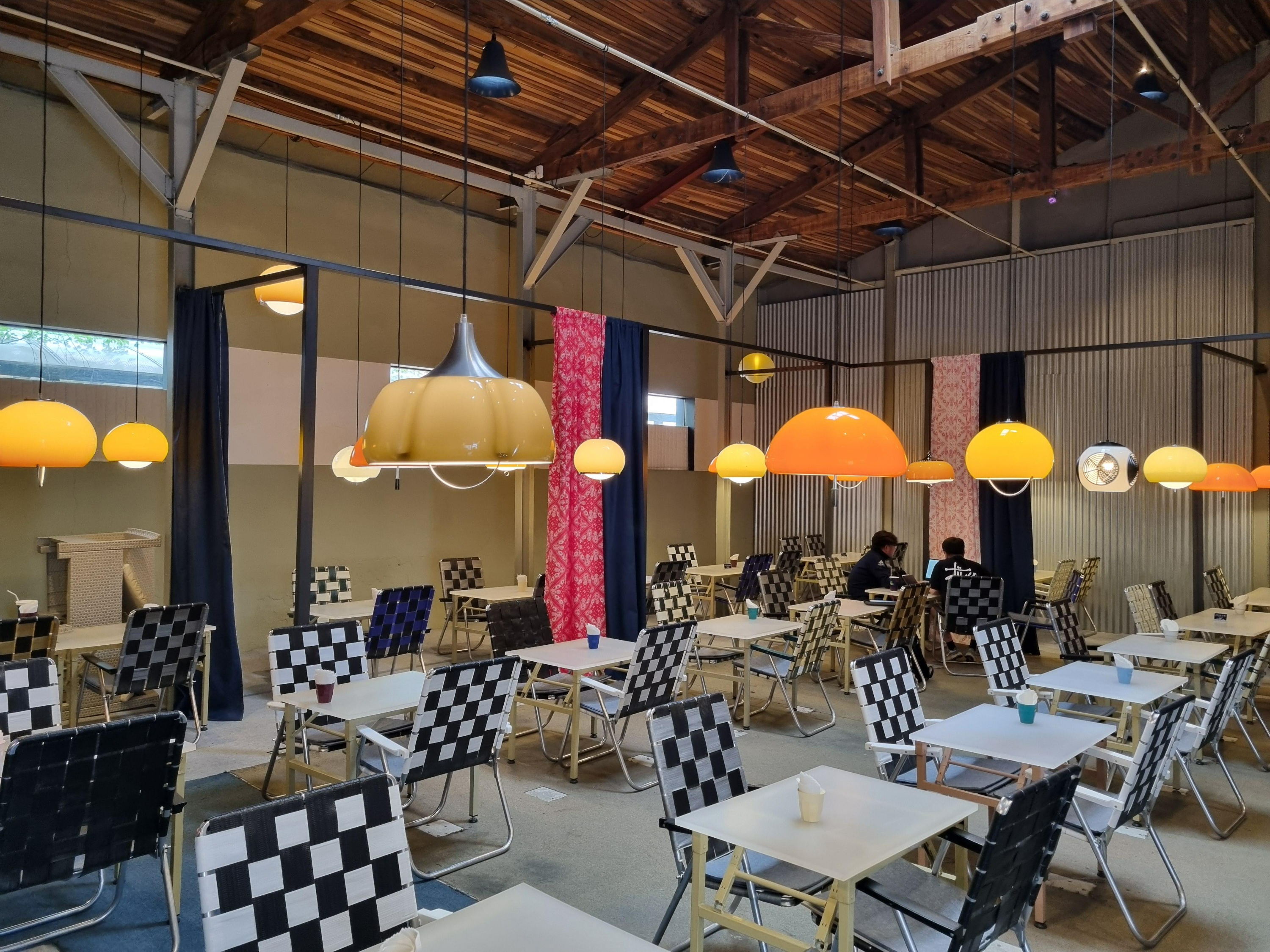 목재로 만들어진 천장 위로 비치는 자연광, 그리고 천천히 회전하는 대형 환풍기는 이 공간에 생명력을 더해줍니다.