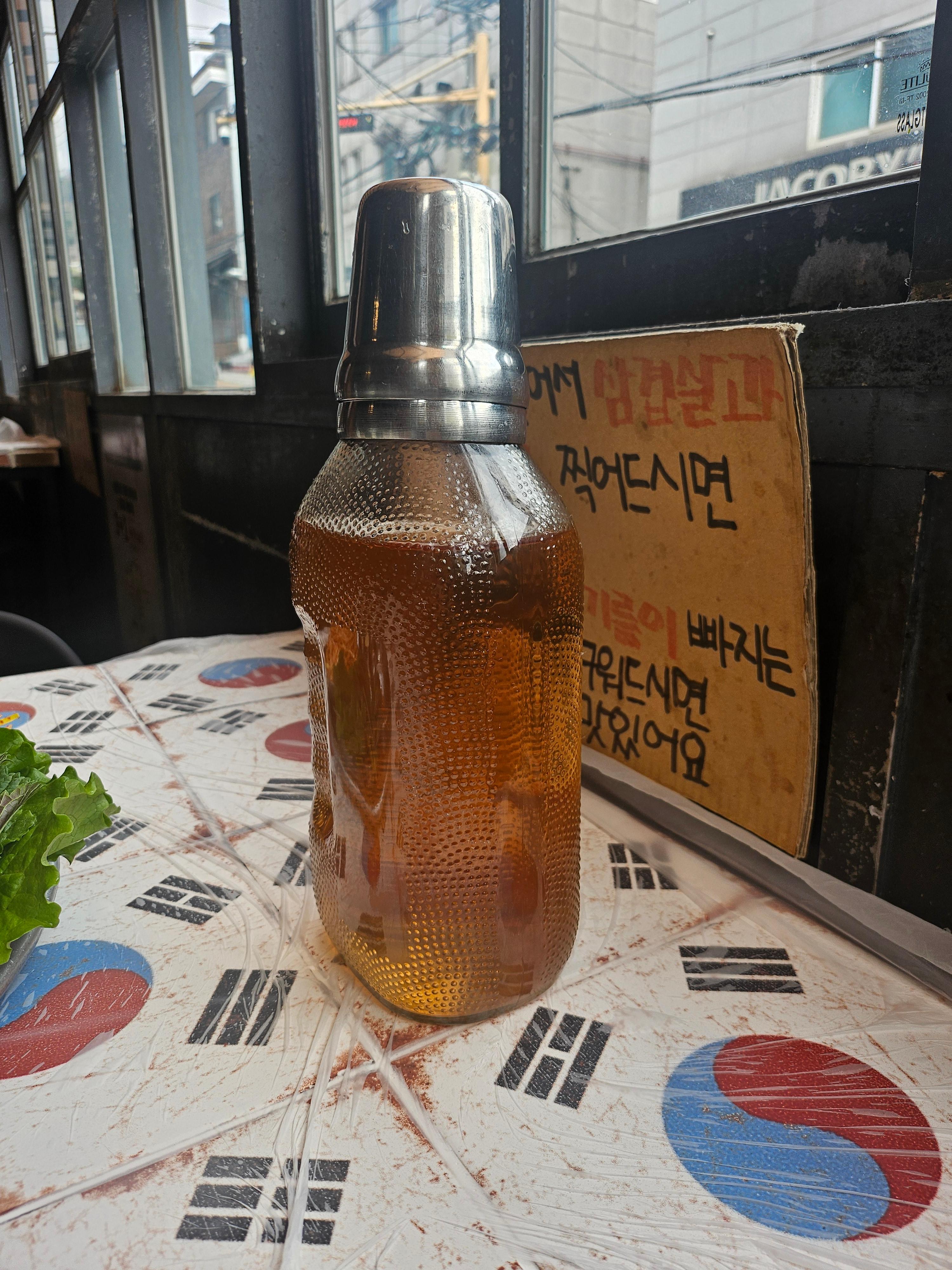 델몬트 주스병에 담겨 나오는 보리차, 박스에 인쇄된 메뉴와 안내 문구, 그리고 타일로 마감된 테이블까지. 억지스럽지 않고 자연스럽다.