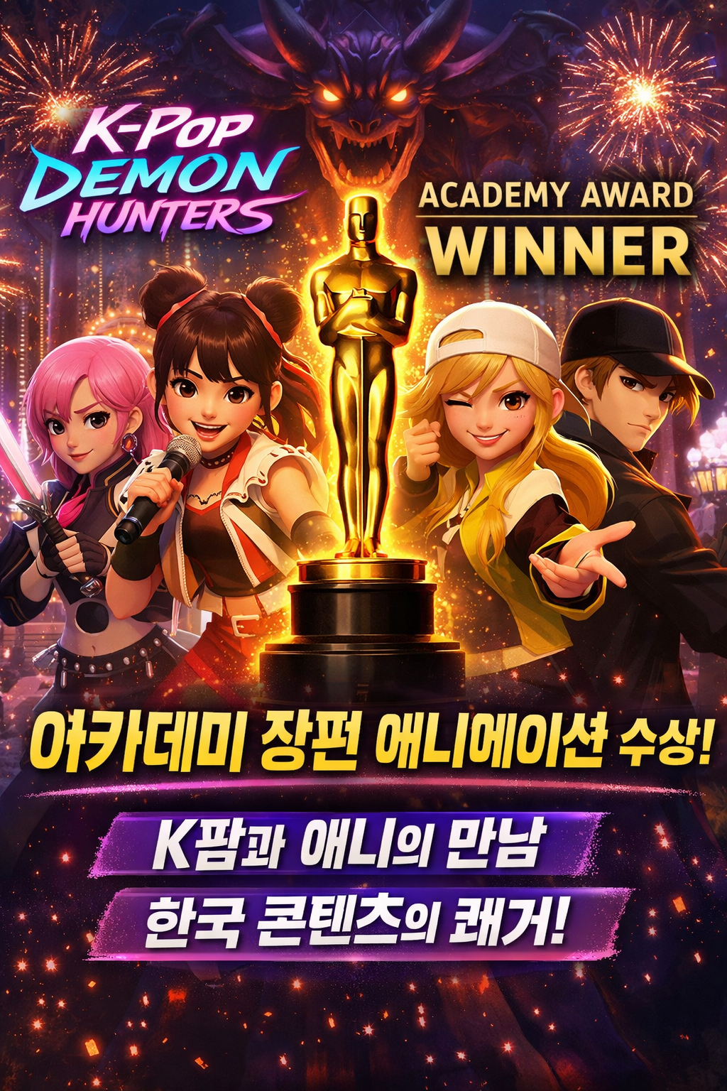 ‘케이팝 데몬 헌터스’의 아카데미 장편 애니메이션상 수상은 단순한 흥행작의 영예가 아닙니다. K팝, 한국적 정서, 글로벌 플랫폼, 애니메이션 기술, 팬덤 문화가 한 지점에서 만났을 때 얼마나 큰 폭발력이 나올 수 있는지 보여준 사건입니다.