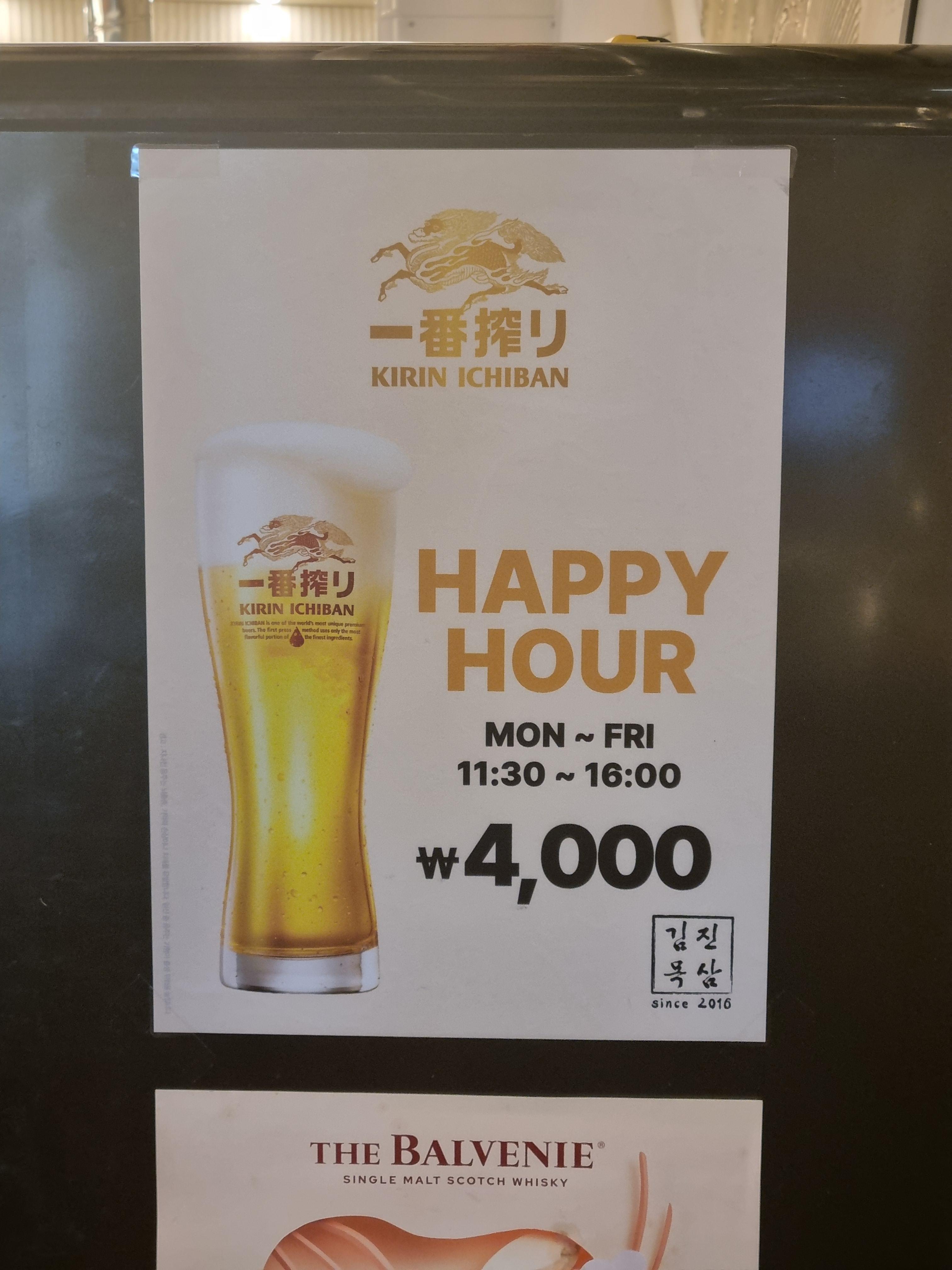 주류: 화요25도, 기린이치방(해피아워 4천원) 포함 총 4잔