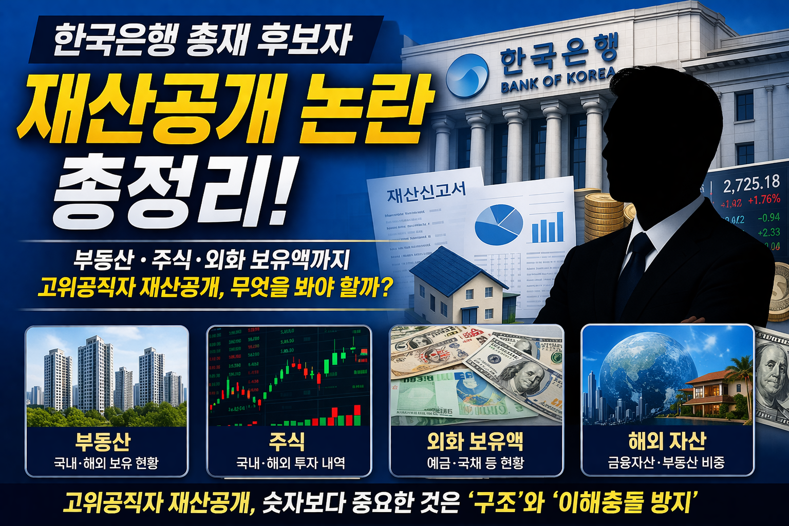 한국은행 후보자 재산공개 이슈는 단순한 인물 검증을 넘어, 고위공직자 재산공개 제도의 본질을 다시 환기시키고 있습니다. 부동산 보유 현황, 주식과 금융투자 자산, 외화 보유액과 해외자산 비중은 이제 각각 독립적인 검증 항목이 됐습니다. 앞으로도 고위공직자 재산 논란은 계속되겠지만, 중요한 것은 숫자에 대한 자극적인 소비가 아니라 공직 신뢰와 이해충돌 방지라는 기준을 놓치지 않는 것입니다.