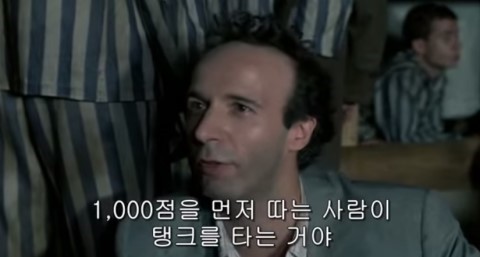 그는 1000점을 먼저 얻는 사람이 진짜 탱크를 상품으로 받는다고 말하며, 수용소의 끔찍한 현실을 아들로부터 숨깁니다.